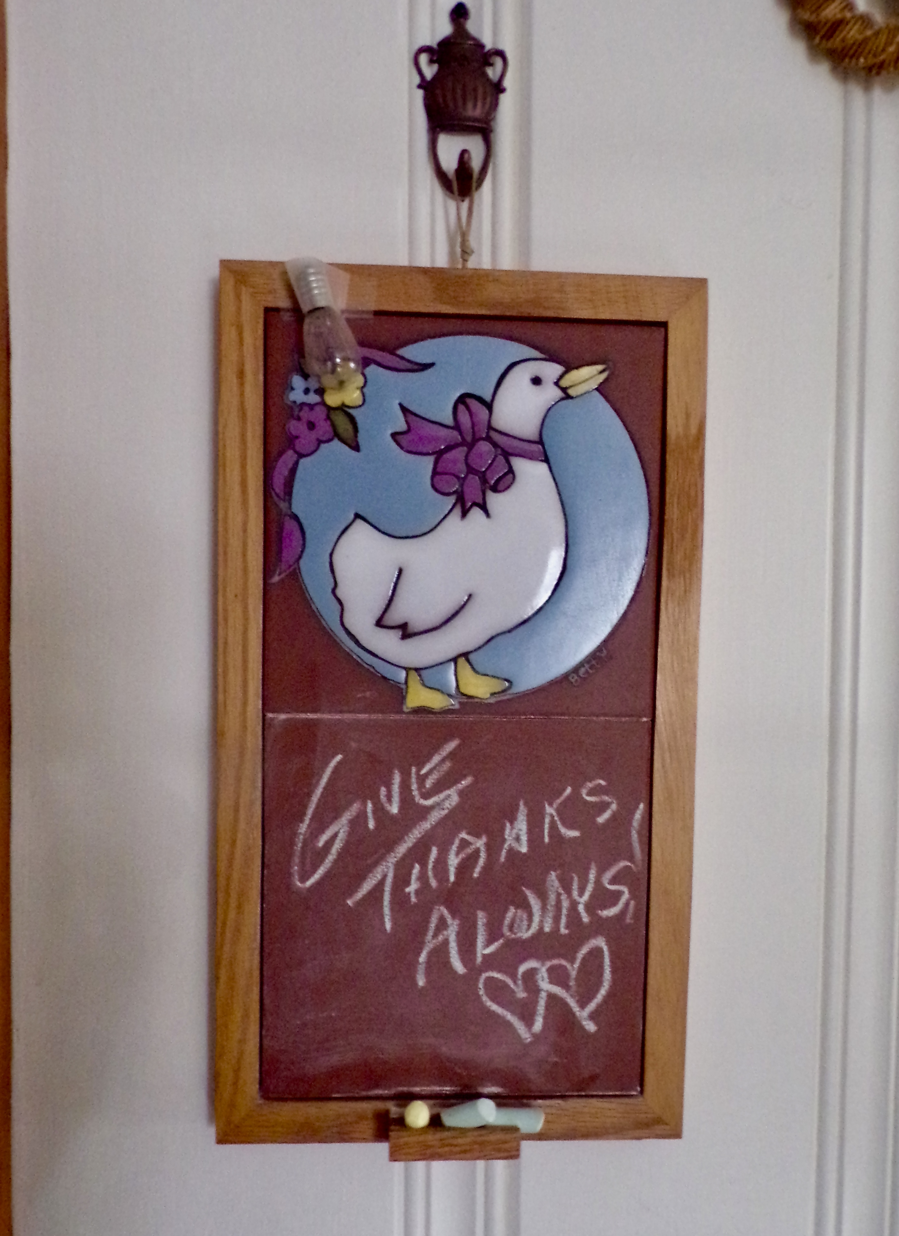 Were you to come into my kitchen, you would likely notice a medium-sized, terra-cotta chalkboard hanging on the wall. It was a Christmas gift from my mother-in-law, Virginia, that has hung there for more than three decades. I love it because it reminds me of how hospitable she was. Over the years I have used the chalkboard to greet visitors with one single word–WELCOME! However, during this past year of the pandemic–when visitors have become a rarity and the news disheartening–the message on the board has been expanded to three words: “Give Thanks Always!”